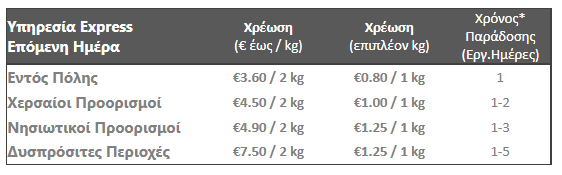 ΕΠΙΒΑΡΥΝΣΗ ΑΠΟΣΤΟΛΗΣ ΓΙΑ ΠΑΡΑΓΓΕΛΙΑ ΚΑΤΩ ΤΩΝ 50,00€ ΜΕ ΦΠΑ ΣΥΜΦΩΝΑ ΜΕ ΤΟΝ ΑΚΟΥΛΟΥΘΟ ΠΙΝΑΚΑ (Οι τιμές συμπεριλαμβάνουν ΦΠΑ):